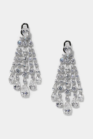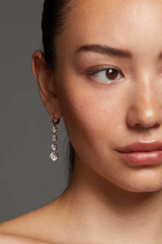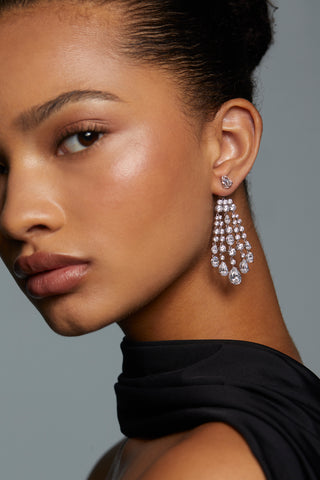 MODEL WEARING RAVISH LAUREL DROP EARRINGS. SHE HAS A HIGH NECKLINE WHITE TOP AND HER DARK BROWN HAIR IS BLOWING IN THE WIND WITH HER EAR FULLY VISIBLE. HER EARS ARE CLOSED.
