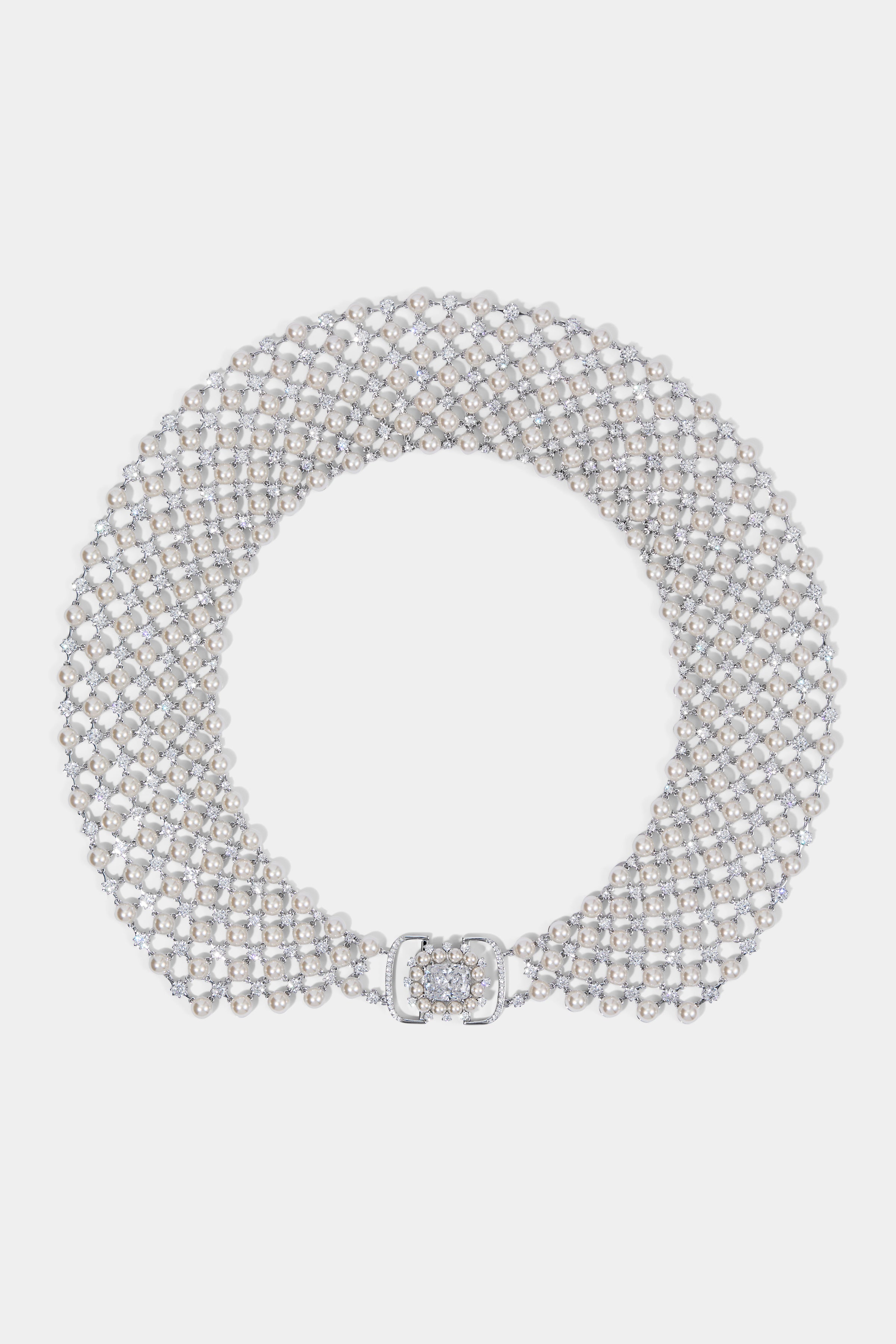 Command attention with timeless elegance. This statement collar reimagines classic pearls in a bold, sculptural silhouette designed to sit elegantly along the neckline. Rows of luminous pearls are hand-set within a lattice of sparkling CZ stones, finished with a statement clasp that adds the perfect touch of glamour. Tip: Wear the clasp at the front or back for two different looks.