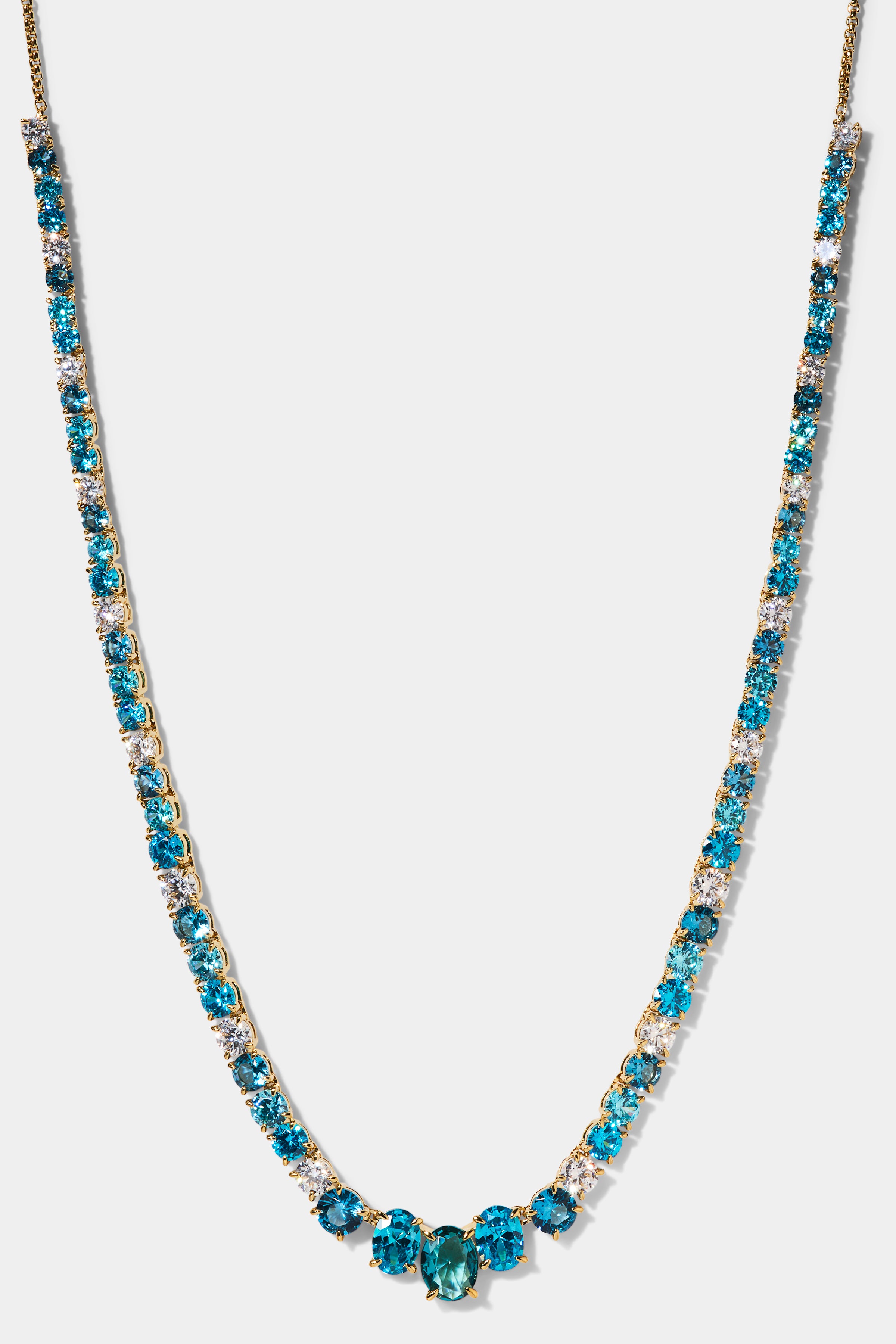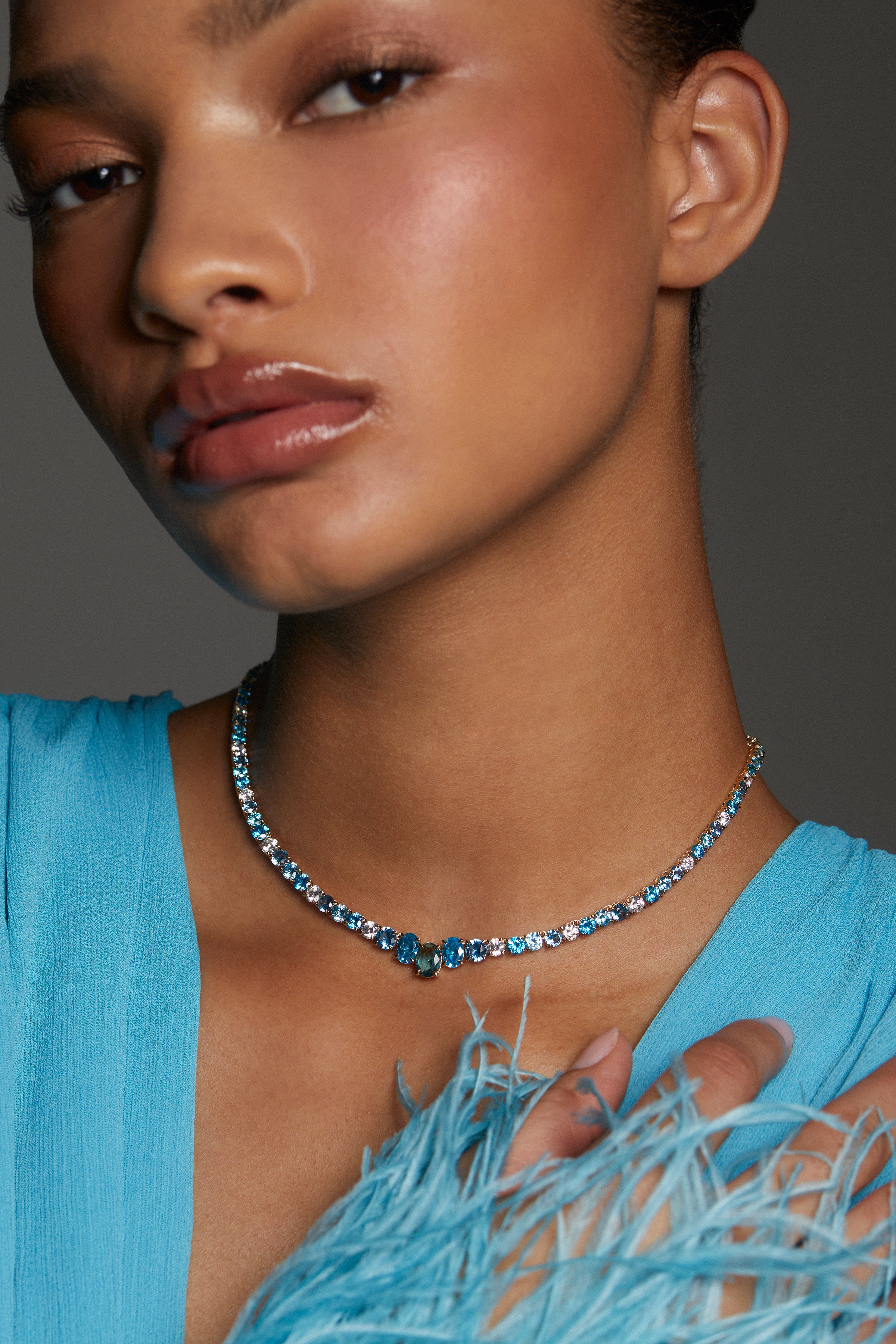 A fresh twist on a classic silhouette, this slider collar necklace features multi-cut stones in ombré shades that shimmer with every move. Perfect for layering or letting it shine solo.
