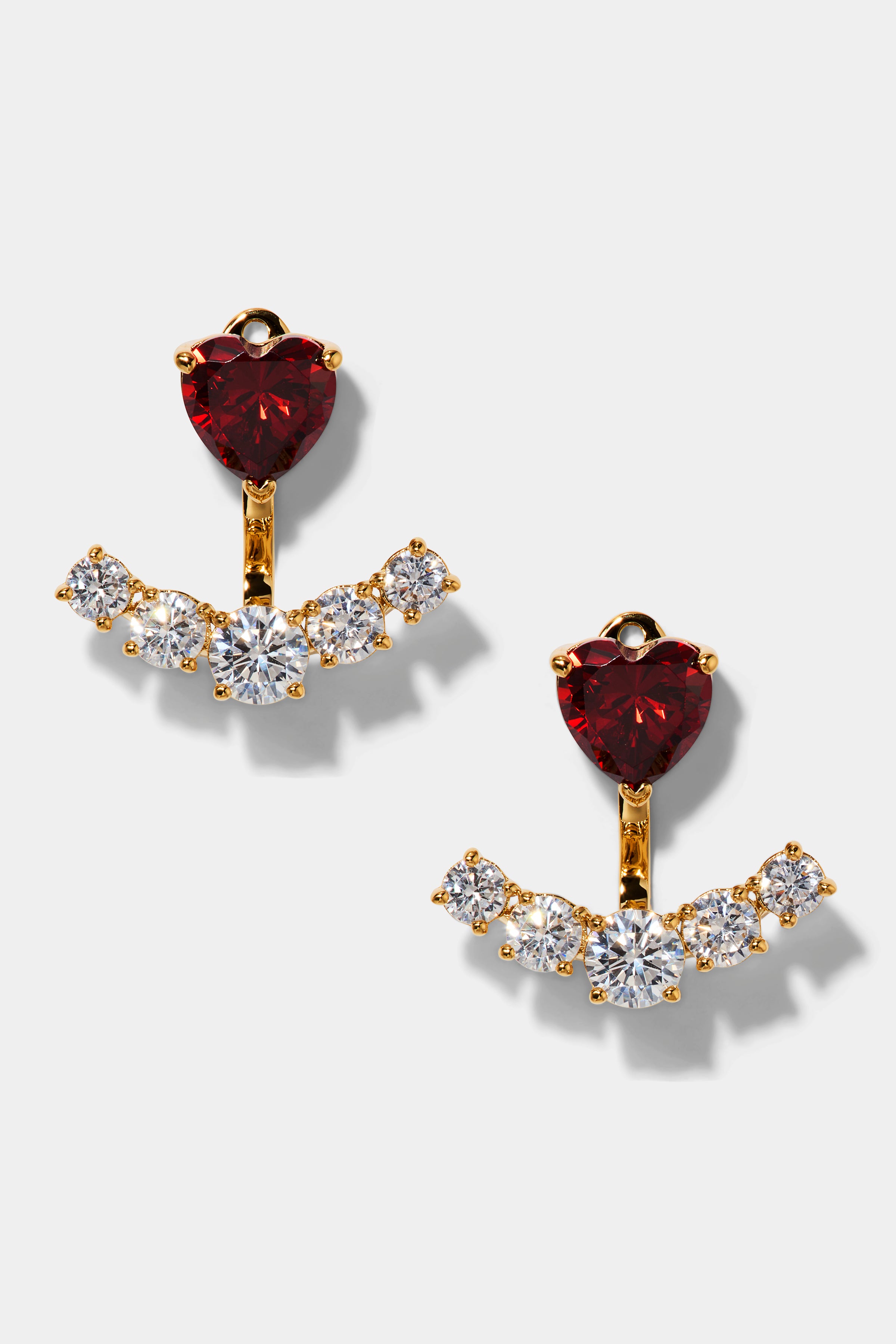 A two-in-one design for versatile styling. These red heart studs include a removable drop jacket that adds a peek of sparkle behind the lobe.