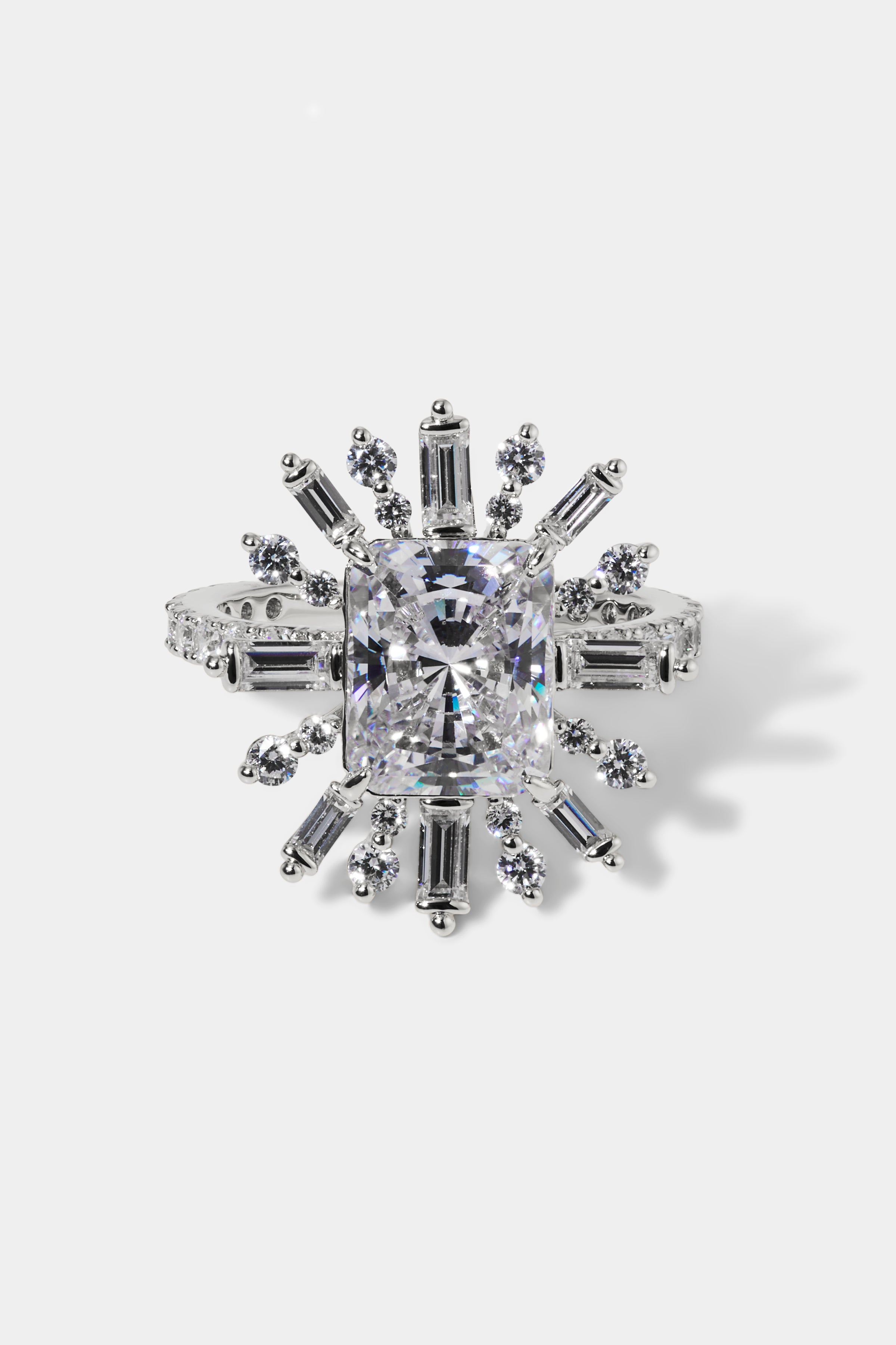 A starburst of sparkle. This bold halo ring features a mix of multi-cut CZ stones set in airy prongs that catch the light from every angle. A statement piece designed to shine on its own.