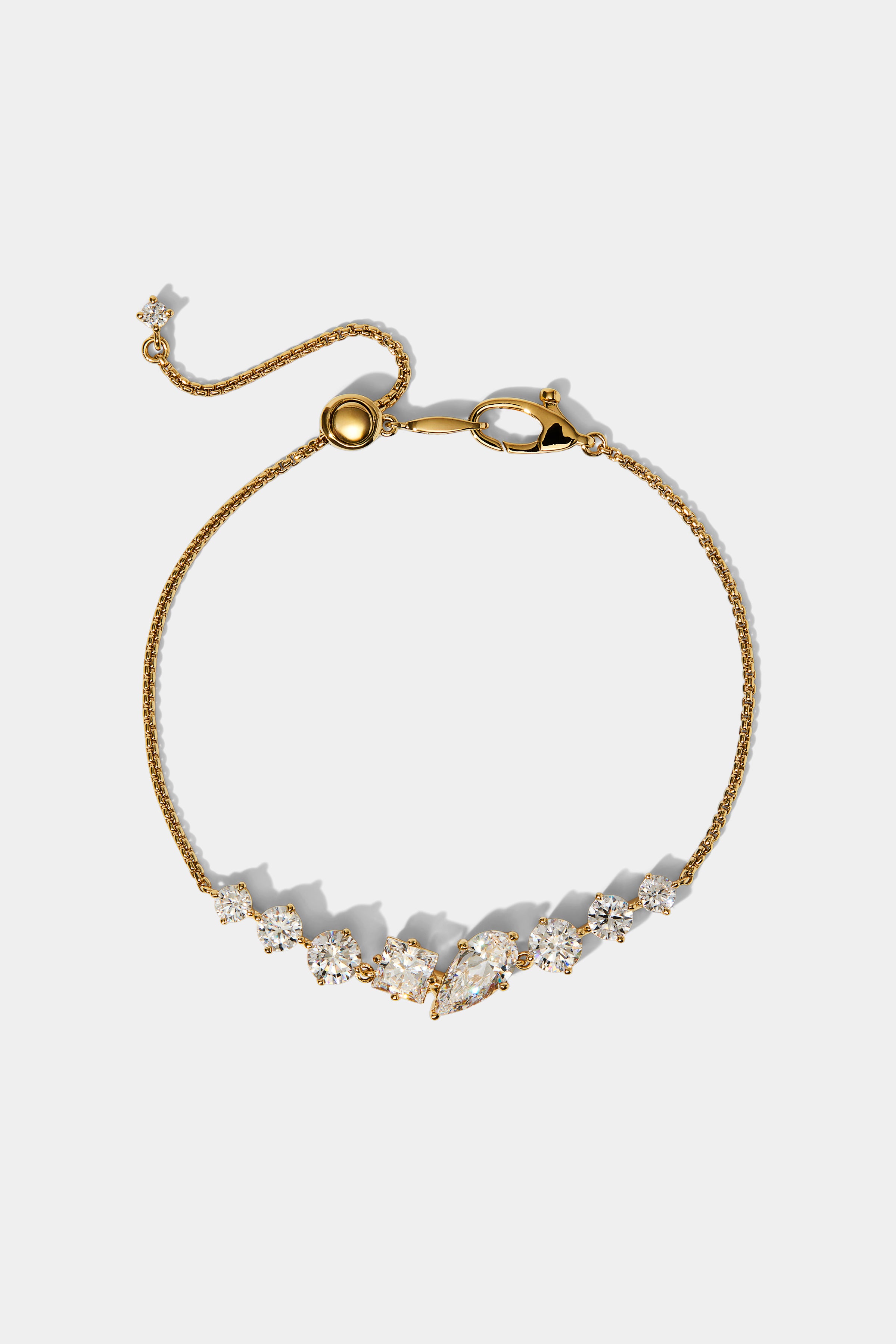 This line bracelet features a sleek row of mixed-cut CZ stones set at soft angles along a delicate chain, creating a light, airy silhouette with subtle dimension. Pointed prong details give each stone a crisp, architectural edge while enhancing brilliance.