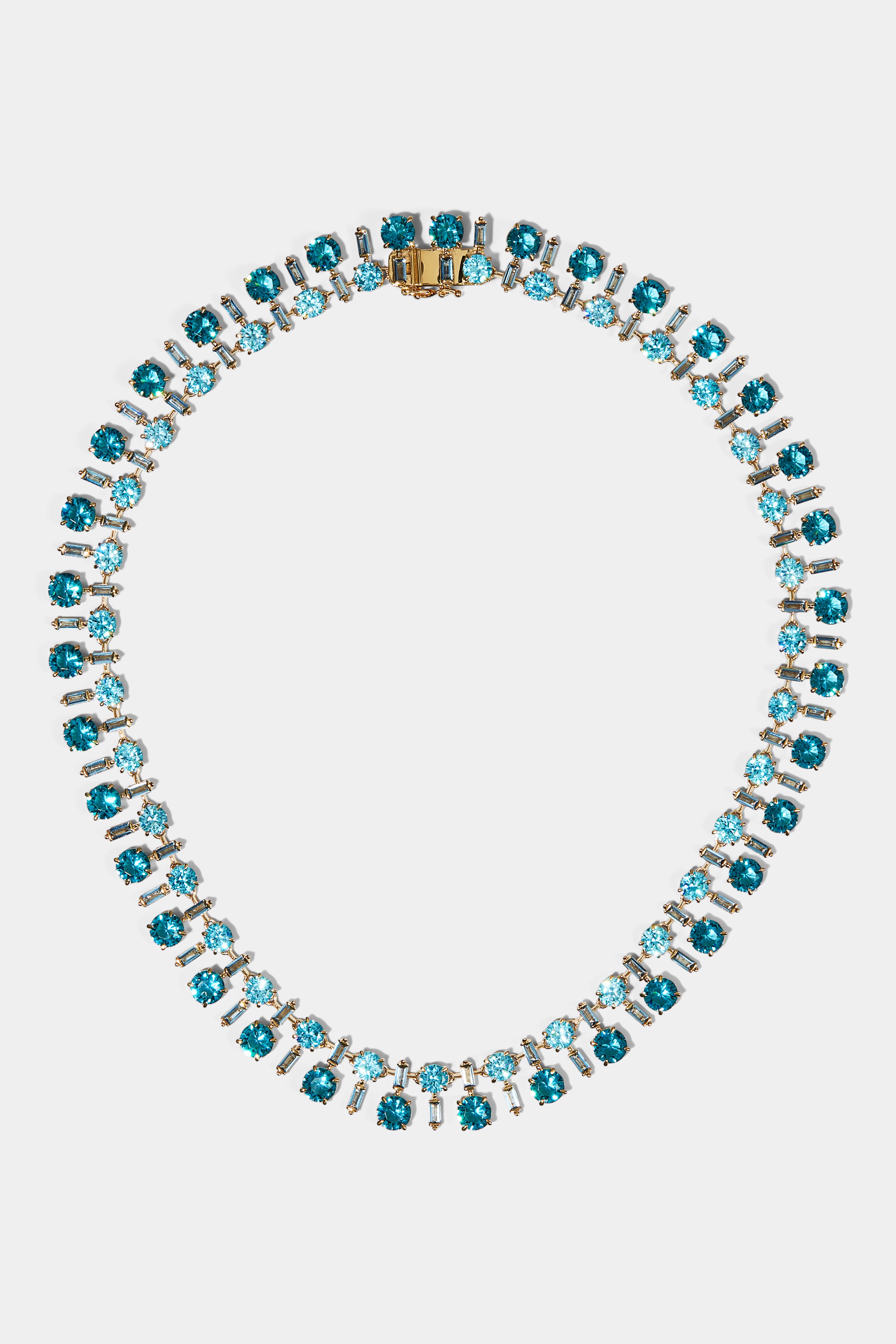 Designed to dazzle, this collar necklace layers ombré tones of aqua to indigo in an eye-catching halo design. With its high-impact shine and modern edge, it’s the ultimate statement necklace for your most glamorous nights.