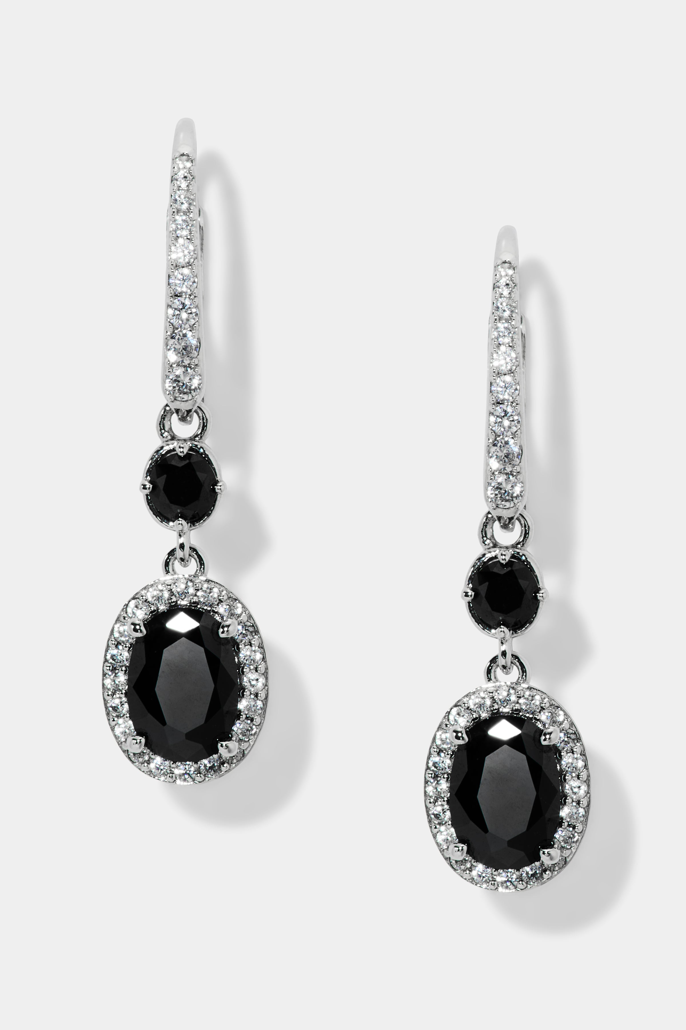 These drop earrings feature a pavé-set hoop that leads into a faceted black round stone and an oval-cut drop framed by a halo of shimmering accents. The deep black stones create striking contrast against the bright pavé details, giving the piece a sleek, dimensional look.