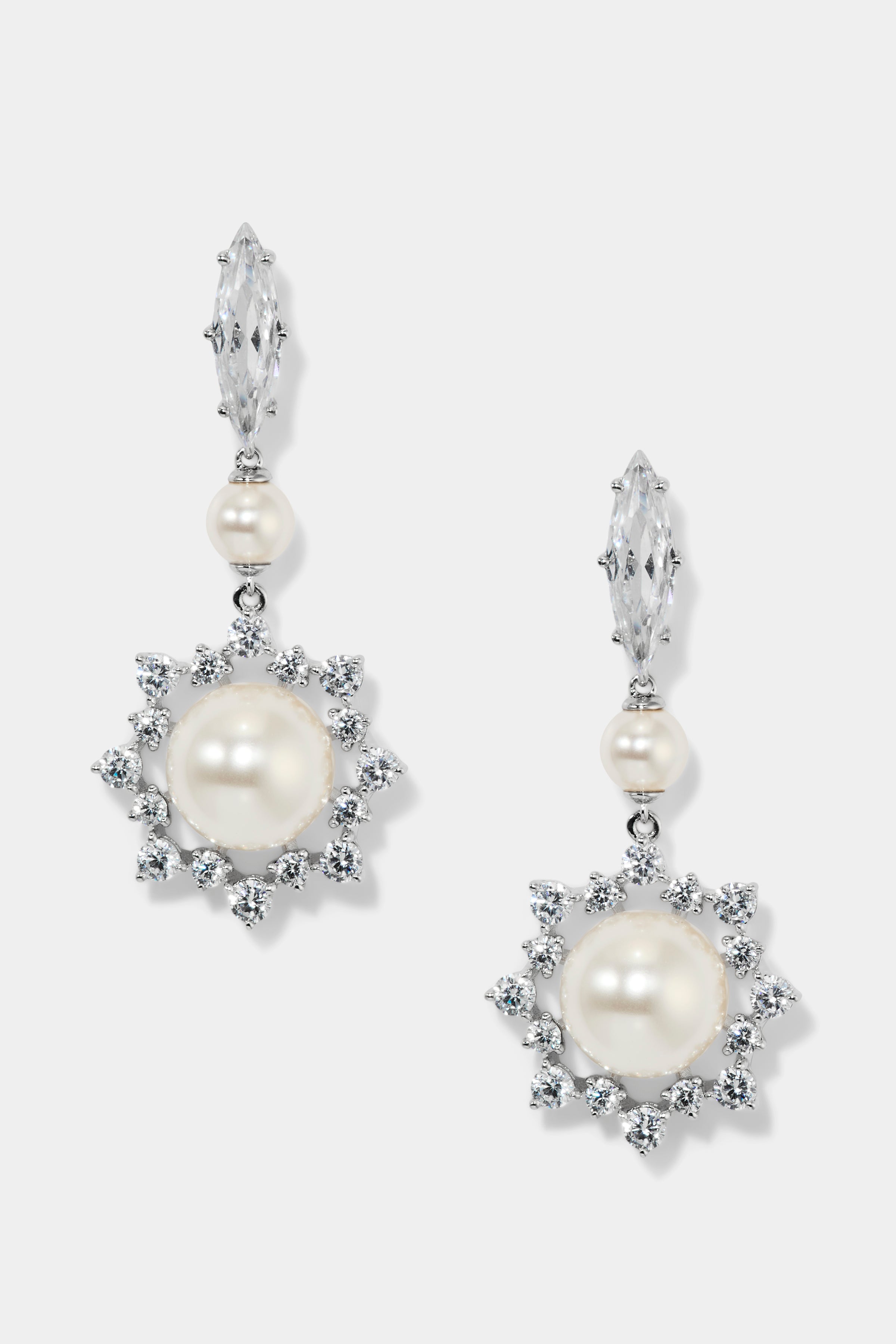These drop earrings feature a luminous round glass pearl suspended beneath a sleek marquise-cut CZ, creating a vertical silhouette that elongates and flatters.