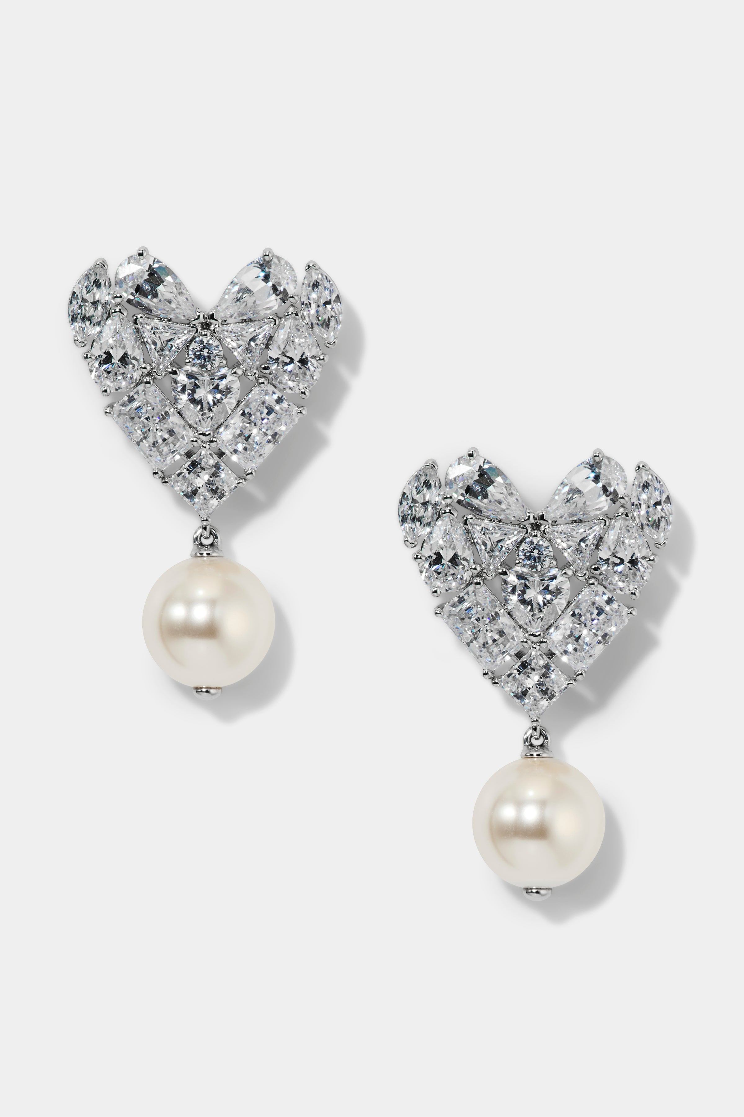 A sculpted heart silhouette composed of mixed fancy-cut CZ stones creates striking dimension and high-impact sparkle. Suspended beneath the heart, a luminous round glass pearl drop softens the look with classic femininity.