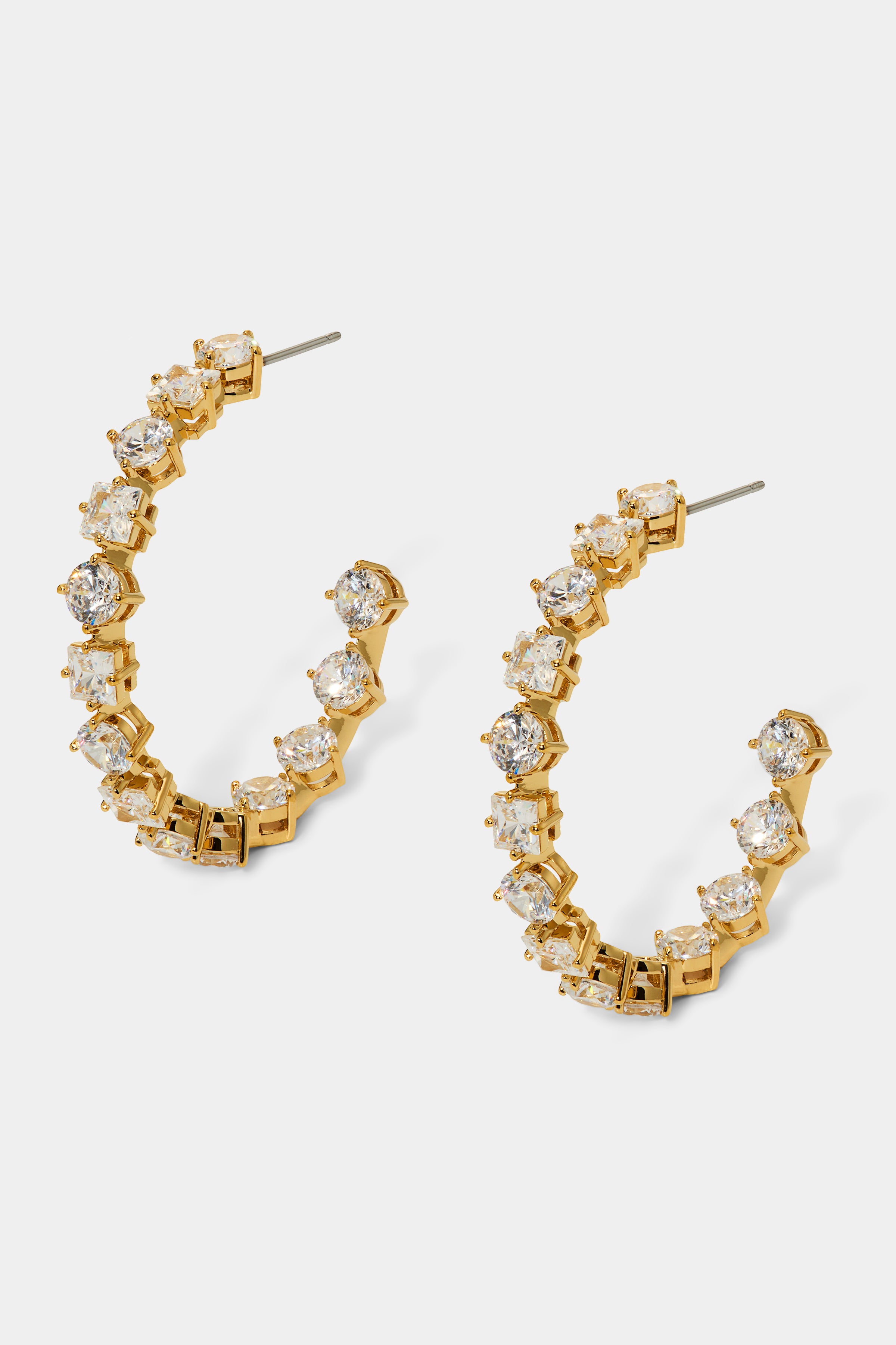 - C-shaped hoop silhouette with mixed CZ stone pattern