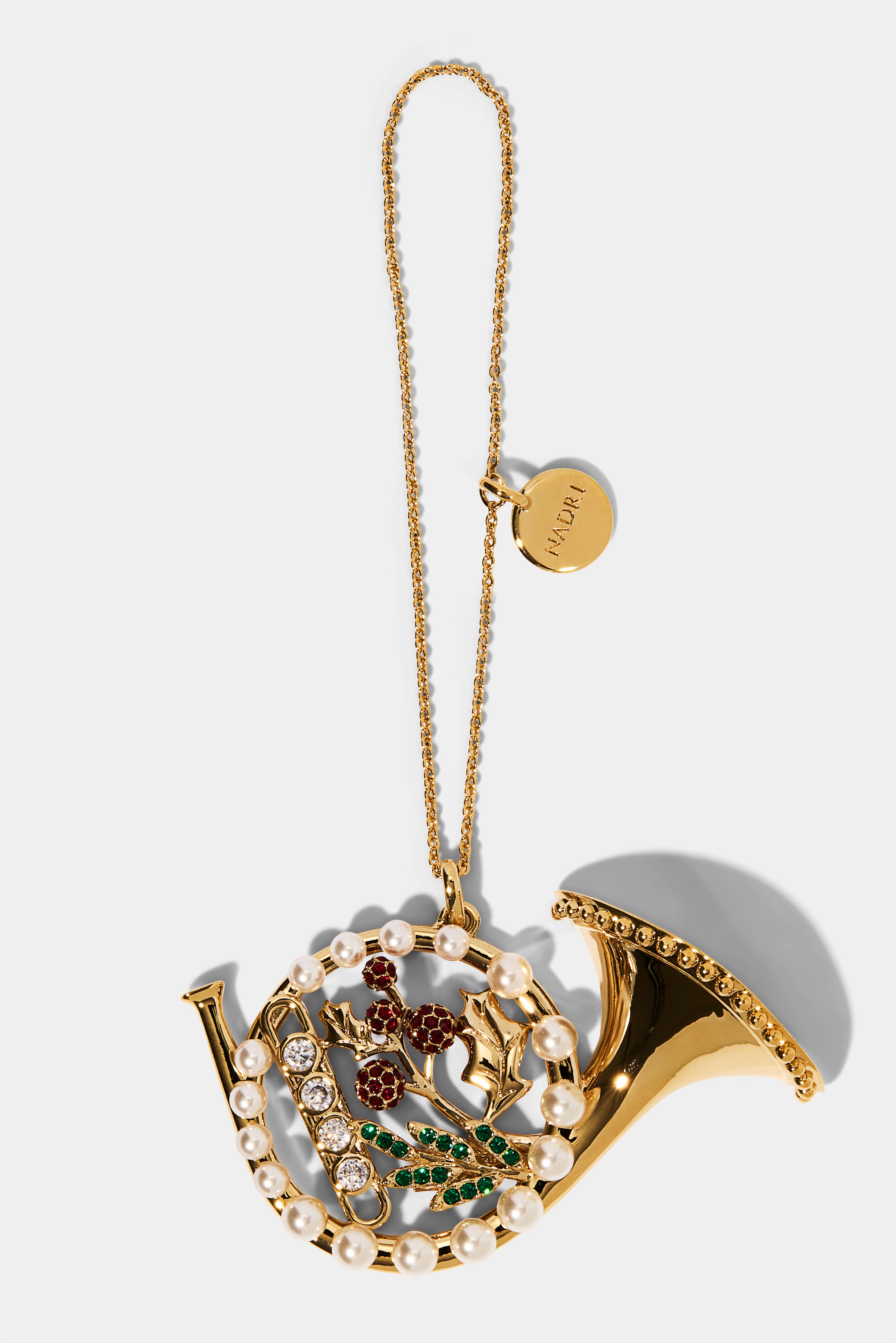 Strike up the holiday cheer. This golden French horn ornament is adorned with sparkling crystals, making it a festive standout that hits all the right notes on your tree.