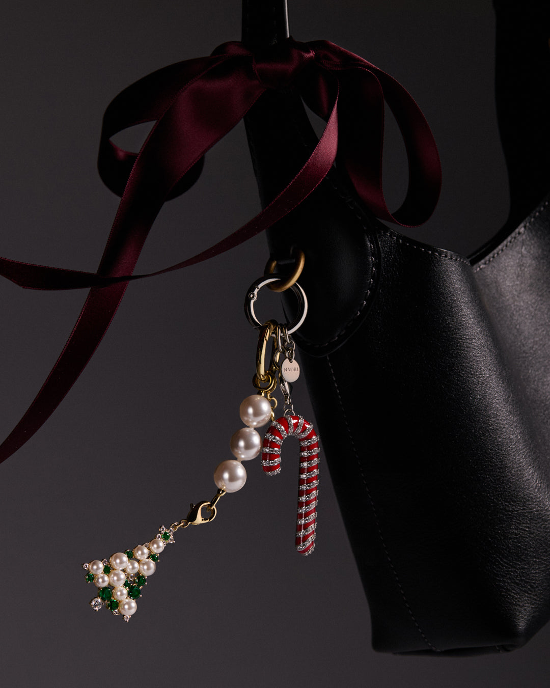 Celebrate the season with refined elegance. This luxurious bag charm features a gracefully sculpted Christmas tree, meticulously adorned with luminous faux pearls, brilliant cubic zirconia, and vibrant green stones that evoke the sparkle of holiday lights. Each detail is artfully set to capture a festive yet sophisticated allure.