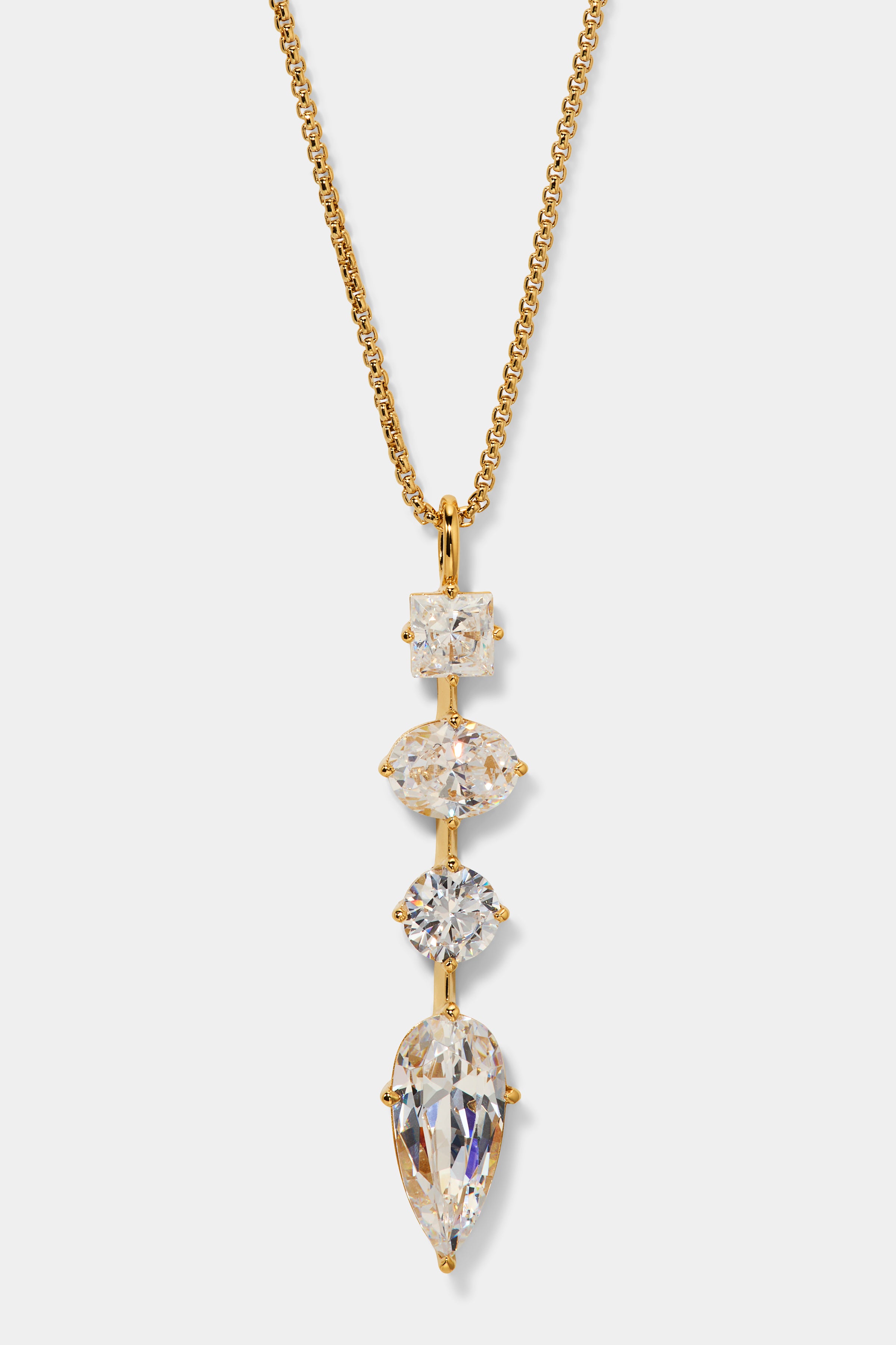 This pendant necklace features a sequence of mixed-cut CZ stones set in refined prongs, creating a striking line of brilliance that feels sharp, intentional, and effortlessly elevated.