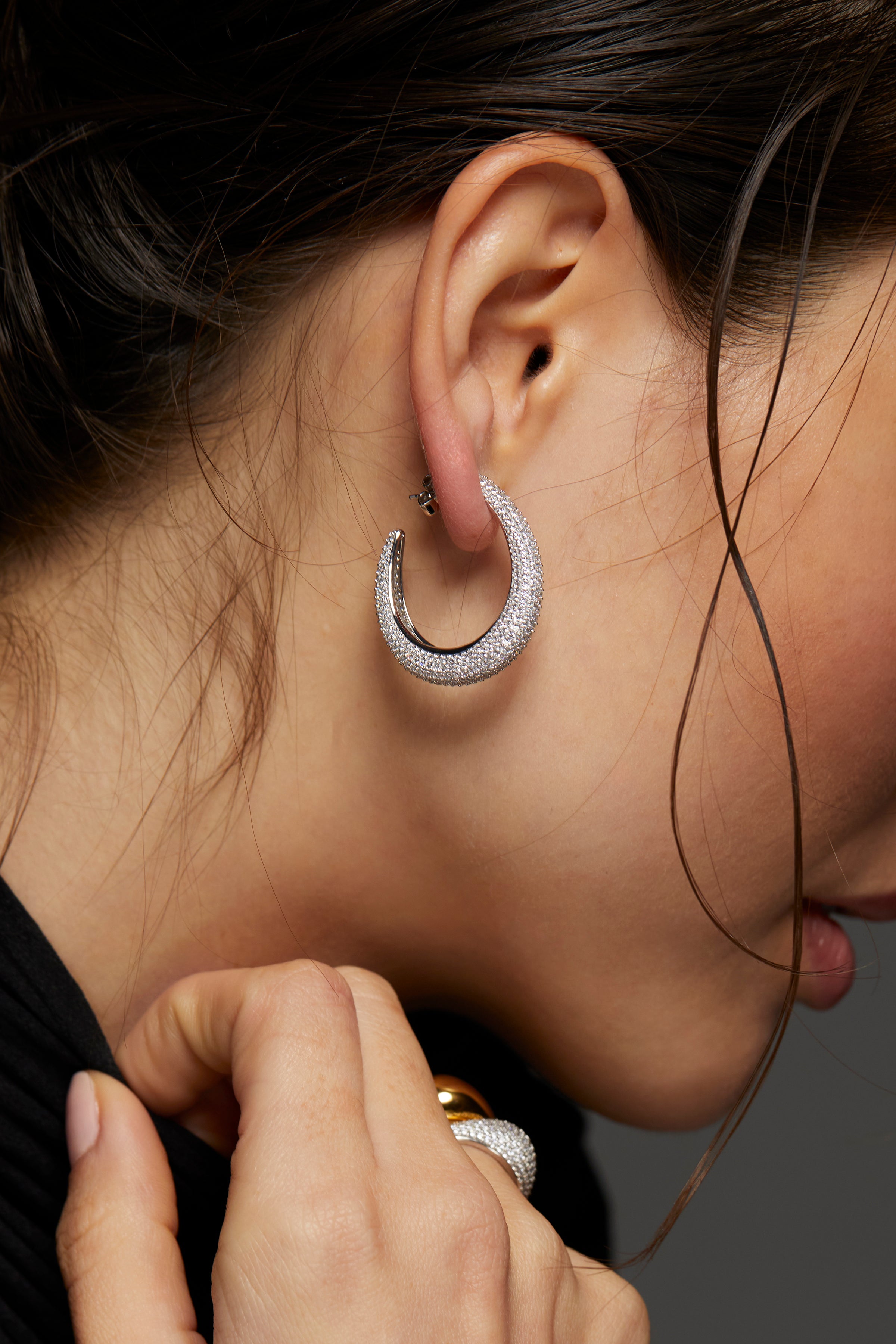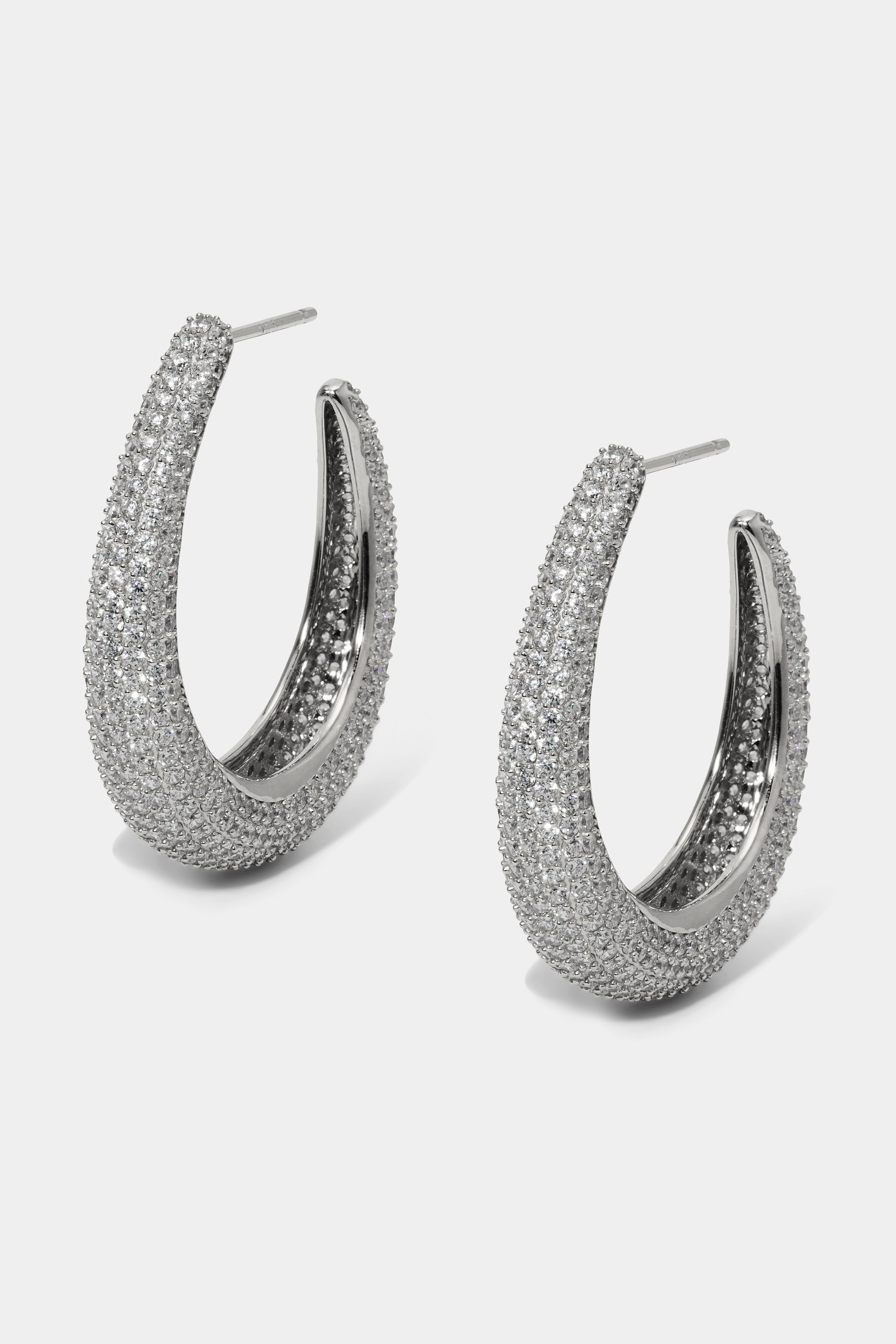 These sculptural C hoops merge bold volume with pavé cubic zirconia detailing for a perfect balance of glamour and edge. Crafted in sterling silver and finished in rhodium or 18kt gold plating, they bring a sense of luxury to your daily rotation.