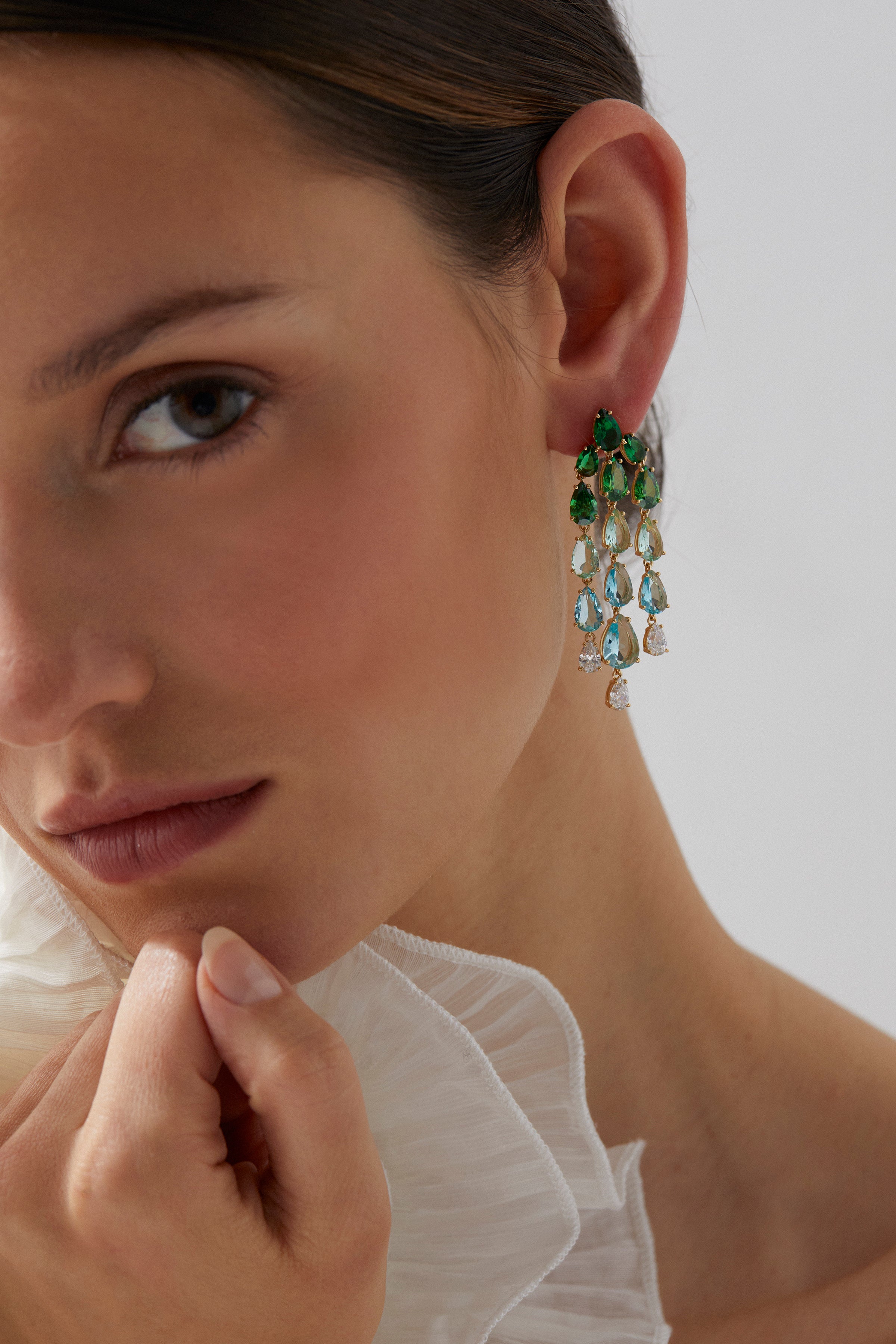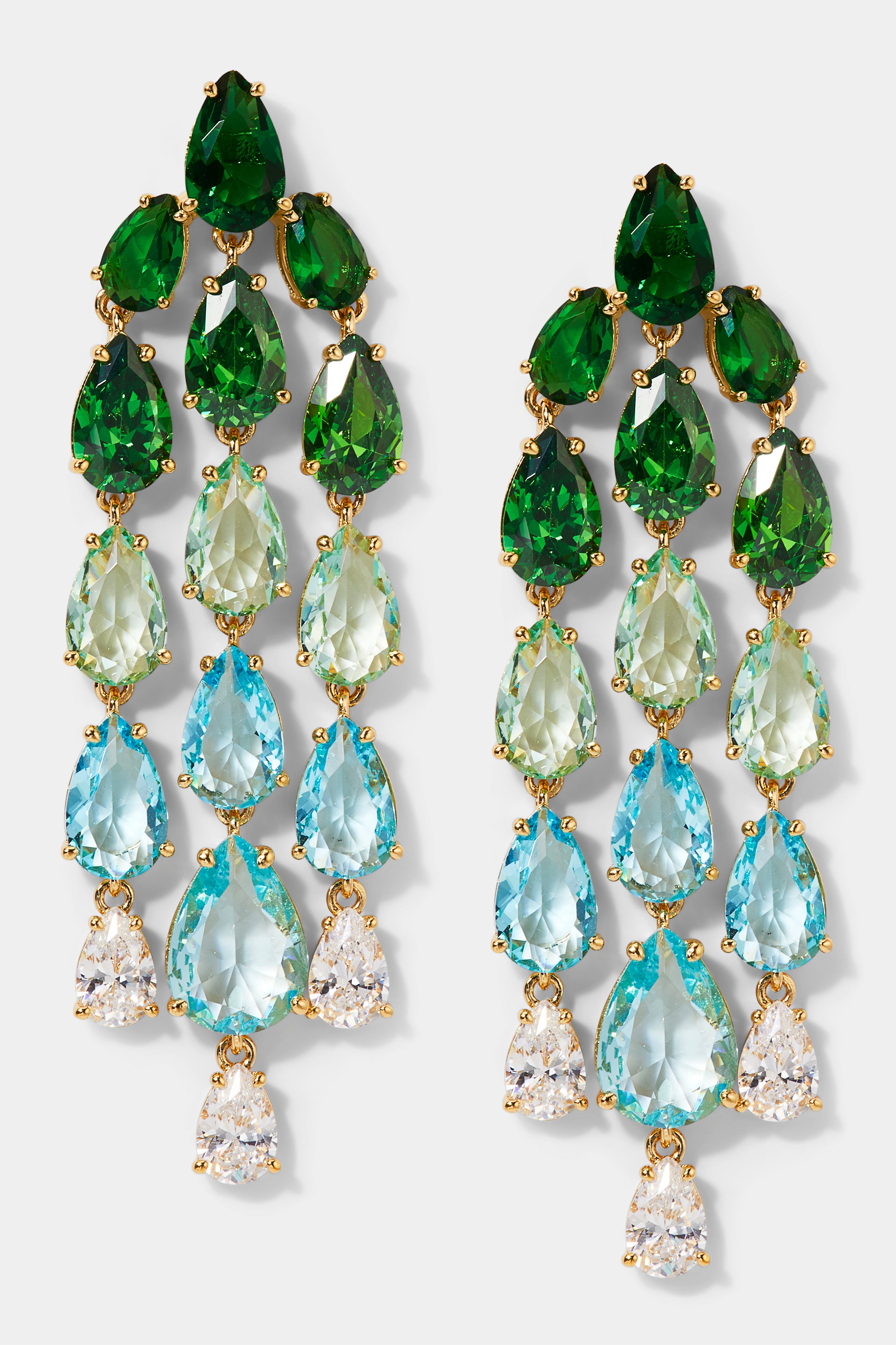 These cascading chandelier earrings layer rich emerald greens with ocean blues in a striking pear-cut design. Designed to move and mesmerize with every step.