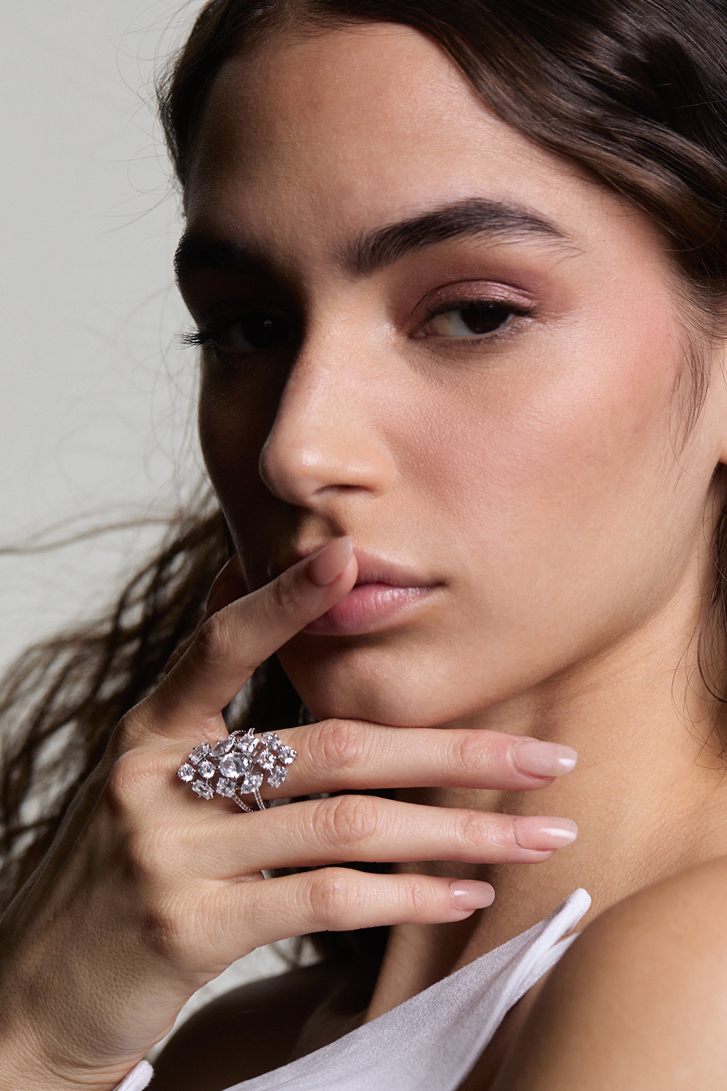 Set on a refined split pavé band, this piece delivers dramatic sparkle with a modern, architectural edge. The elongated shape flatters the finger, creating a lengthening effect while catching the light with every angle.