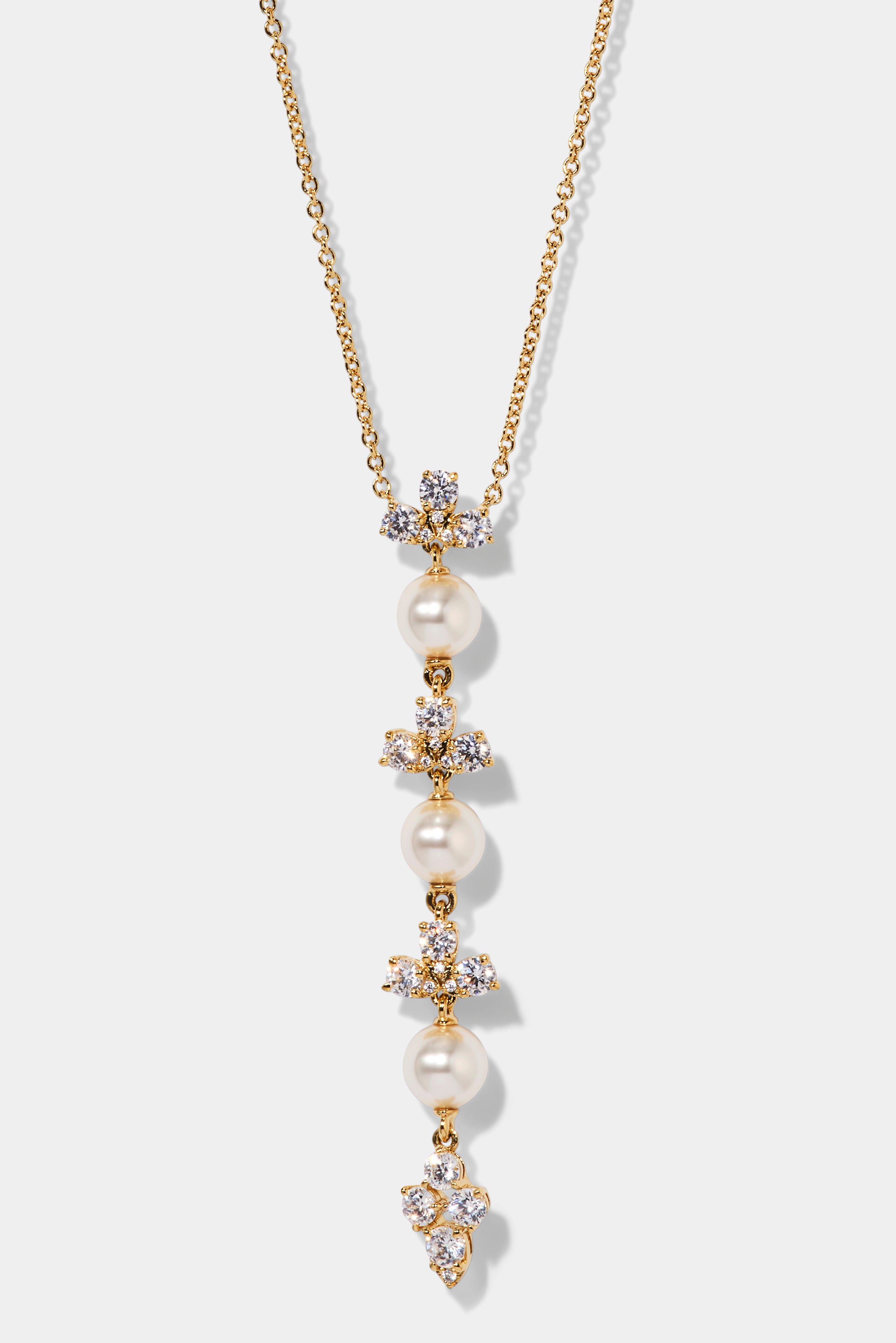 Classic pearls, modern twist. This Y-drop design features pearls in varying sizes with sparkling CZ accents, adding a graceful elongation to your neckline.