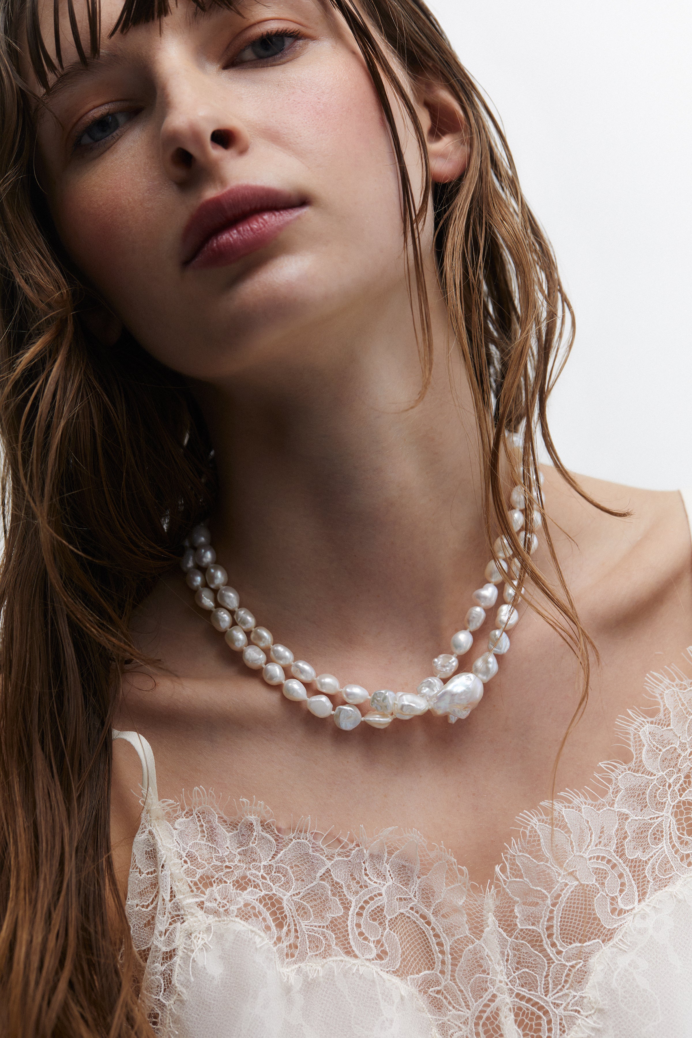 This double-strand necklace elevates a timeless silhouette with modern proportions and luminous freshwater pearls. The layered design adds depth and dimension while maintaining a refined, polished look.