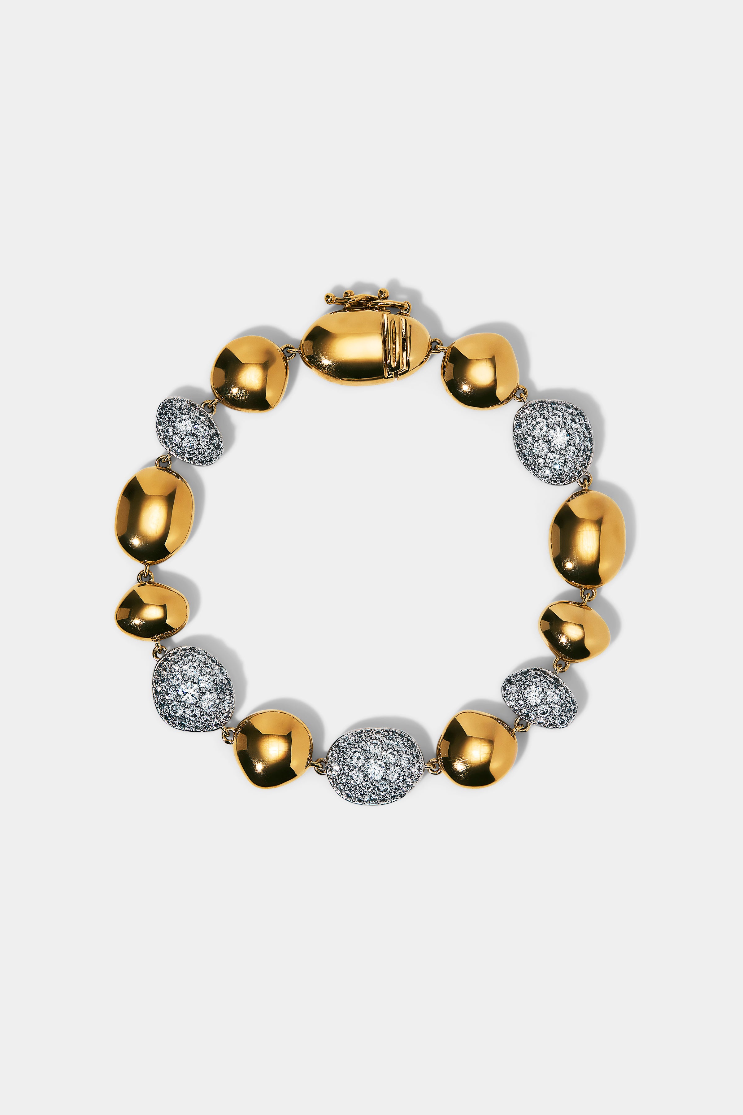 This bracelet features rounded pebble-shaped links accented with crushed pavé CZ stations, creating a two-tone design. The contrast between sleek surfaces and textured sparkle creates a dimensional, light-catching look.